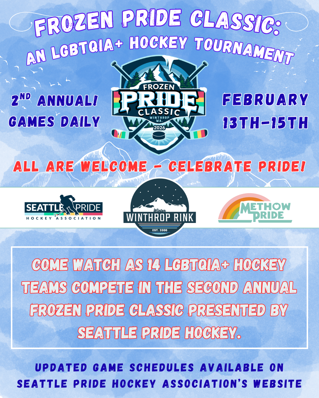 Come watch as 14 LGBTQIA+ hockey teams compete in the Frozen Pride Classic presented by Seattle Pride Hockey. Find the game schedule at https://www.seattlepridehockey.org/frozen/