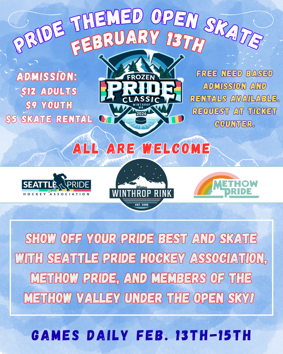 Don your pride best and skate with Seattle Pride Hockey Association, Methow Pride, and members of the Methow Valley under the open sky!